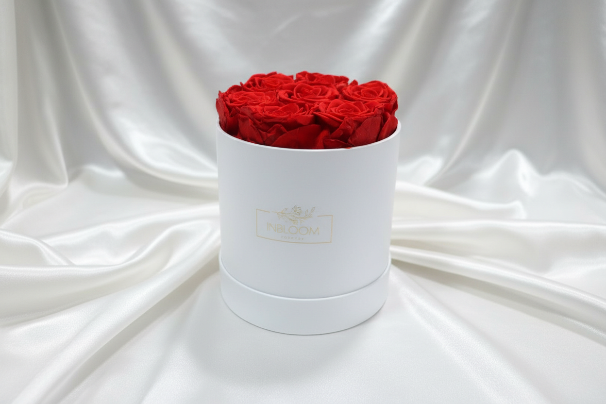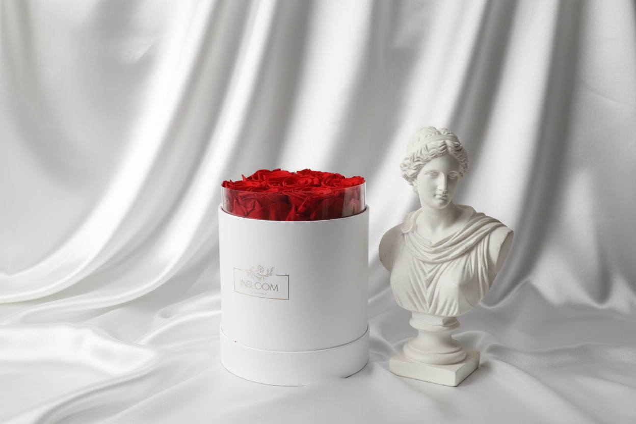 Elegant Round Box with Lid – A premium round box that keeps the roses protected while offering a sophisticated presentation, perfect for gifting or display.