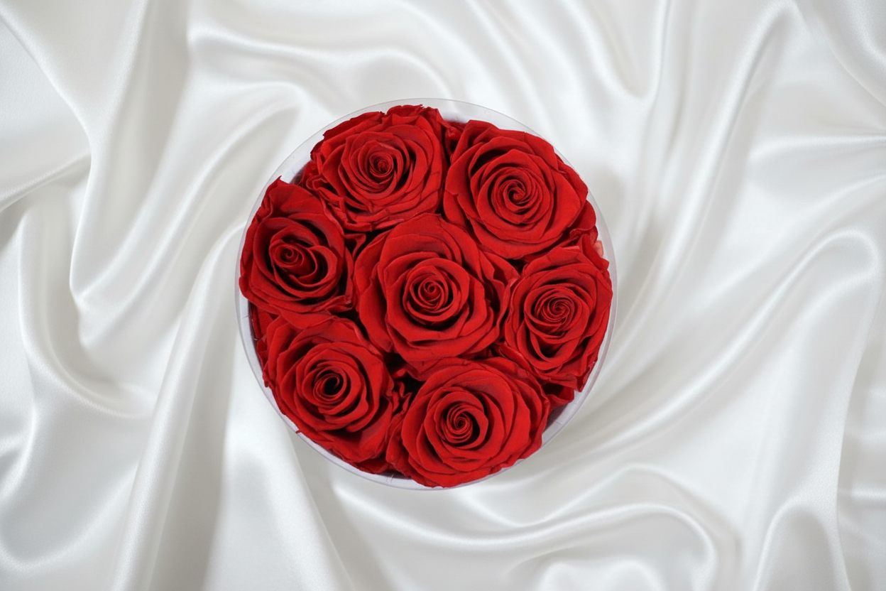 7 Luxurious Red Forever Roses – Real roses expertly preserved to retain their deep crimson color and velvety texture for years, symbolizing everlasting love and passion.